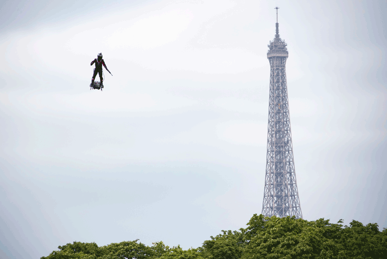 Ένας Γάλλος εφευρέτης και επιχειρηματίας «πέταξε» σήμερα πάνω από τη λεωφόρο των Ηλυσίων Πεδίων με ένα flyboard με στροβιλοκινητήρα, πάνω από τα κεφάλια του Γάλλου προέδρου Εμανουέλ Μακρόν και άλλων ηγετών της ΕΕ που παρακολουθούσαν την ετήσια στρατιωτική παρέλαση για τον εορτασμό της Ημέρας της Βαστίλης.