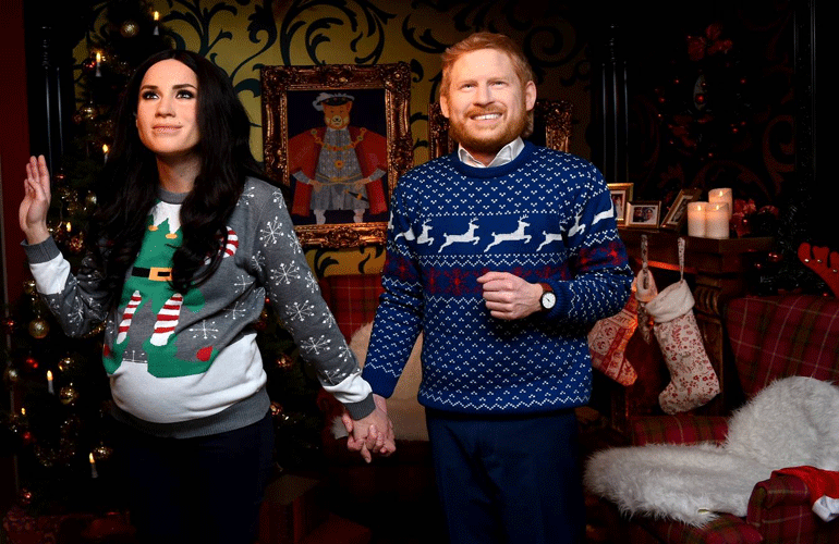 Ντυμένοι με χριστουγεννιάτικα πουλόβερ και με φανταχτερές γιρλάντες γύρω από τους λαιμούς τους, η έγκυος Μέγκαν Μαρκλ και ο σύζυγός της, ο πρίγκιπας Χάρι, χαμογελούν πλατιά και χαιρετίζουν θερμά τους επισκέπτες στο μουσείο της Μαντάμ Τισό στο Βερολίνο.