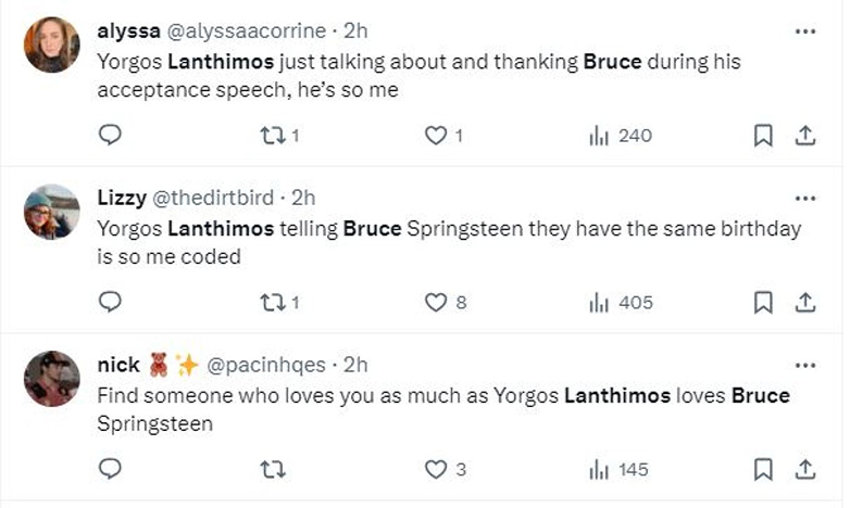 «Ο Λάνθιμος ανέφερε δύο φορές τον Μπρους Σπρίνγκστιν στην ευχαριστήρια ομιλία του γιατί είναι το είδωλό του. Και γιατί όχι άλλωστε;» αναφέρει μια ανάρτηση. «Να βρείτε κάποιον να σας αγαπάει όπως ο Λάνθιμος τον Μπρους Σπρίνγκστιν» σημειώνει ένας άλλος σχολιαστής. «Ένας ακόμη λόγος να αγαπάς τον Λάνθιμο» προσθέτει ένας άλλος.