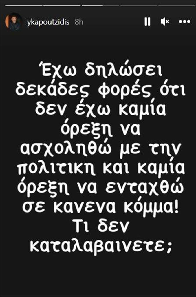 Ο ηθοποιός, σεναριογράφος και παρουσιαστής έδωσε την απάντησή του μέσω δύο stories στο Instagram, αναφέροντας: «Έχω δηλώσει δεκάδες φορές ότι δεν έχω καμία όρεξη να ασχοληθώ με την πολιτική και καμία όρεξη να ενταχθώ σε κανένα κόμμα! Τι δεν καταλαβαίνετε;». «Ανήκω στις γάτες μου! Πουθενά αλλού!».