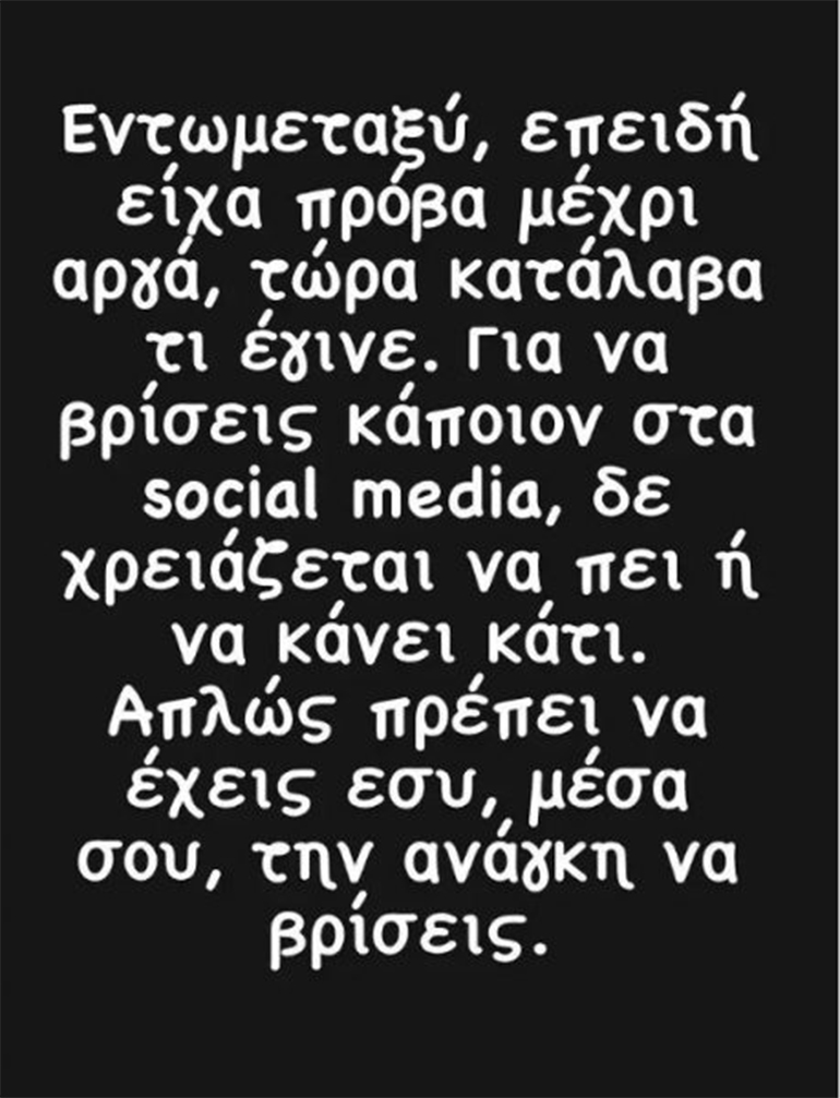 Στη συνέχεια σημείωσε: «Εν τω μεταξύ, επειδή είχα πρόβα μέχρι αργά, τώρα κατάλαβα τι έγινε. Για να βρίσεις κάποιον στα social media, δεν χρειάζεται να πει ή να κάνει κάτι. Απλώς, πρέπει να έχεις εσύ, μέσα σου, την ανάγκη να τον βρίσεις».