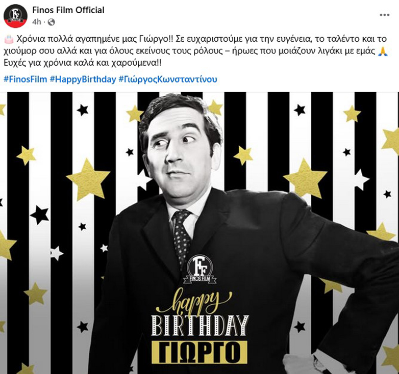 «Χρόνια πολλά αγαπημένε μας Γιώργο!! Σε ευχαριστούμε για την ευγένεια, το ταλέντο και το χιούμορ σου, αλλά και για όλους εκείνους τους ρόλους – ήρωες που μοιάζουν λιγάκι με εμάς. Ευχές για χρόνια καλά και χαρούμενα!!»