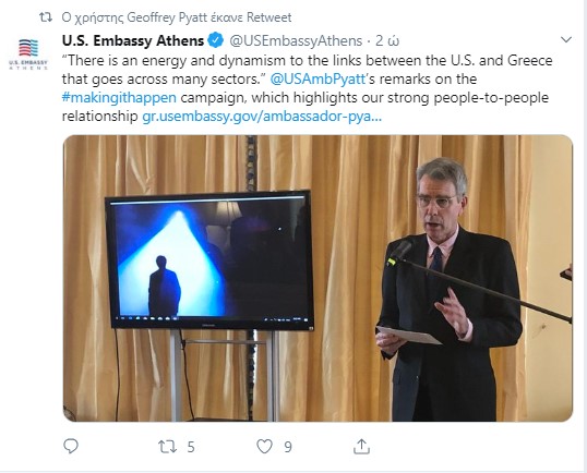«Κάποιοι από εσάς μπορεί να θυμηθούν την πρώτη φάση αυτής της εκστρατείας, την οποία ξεκινήσαμε στη Θεσσαλονίκη κυρίως τον Σεπτέμβριο στην ΔΕΘ. Τώρα ξεκινάμε τη δεύτερη φάση, η οποία προωθεί ιδιαίτερα τους Έλληνες και τους Ελληνοαμερικανούς που ενσαρκώνουν τη διμερή σχέση ΗΠΑ-Ελλάδας, ανθρώπους που έχουν πάρει τις καλύτερες πρακτικές από τις σπουδές τους ή τη σταδιοδρομία τους στις ΗΠΑ και τις έχουν εφαρμόσει στο έργο τους και ζουν εδώ Ελλάδα. Αυτά είναι άτομα που είναι ηγέτες στον πολιτισμό, στην κοινωνία των πολιτών, στην επιστημονική έρευνα και στη μηχανική» ,πρόσθεσε.