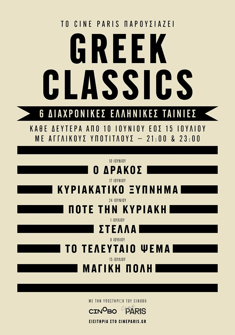 Το Greek Classics ξεκινά σήμερα ( Δευτέρα 10 Ιουνίου) με 2 προβολές (21:00 και 23:00) της αποκατεστημένης κόπιας της ταινίας του Νίκου Κούνδουρου, Ο Δράκος, και θα συνεχίζεται κάθε Δευτέρα ως τις 15 Ιουλίου. Όλες οι ταινίες του αφιερώματος θα προβληθούν με αγγλικούς υπότιτλους, σε ένα κάλεσμα προς το διεθνές κοινό που βρίσκεται στην Αθήνα ώστε να απολαύσει διαμάντια του ελληνικού σινεμά στον ξεχωριστό χώρο του Cine Paris.