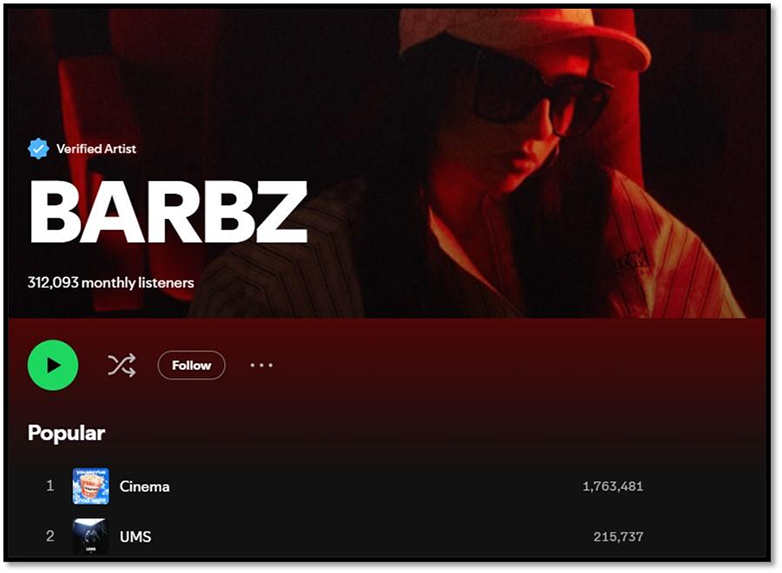 Η Barbz έχει στο portfolio της ήδη διεθνείς διακρίσεις, αφού καταγράφει εκατομμύρια streams με τα τραγούδια της “Cinema” και “UMS”. Και τα δύο τραγούδια αποτελούν συμπράξεις με τους global hitmakers παραγωγούς & DJs YouNot Us, Cheat Codes & twocolors αντίστοιχα!