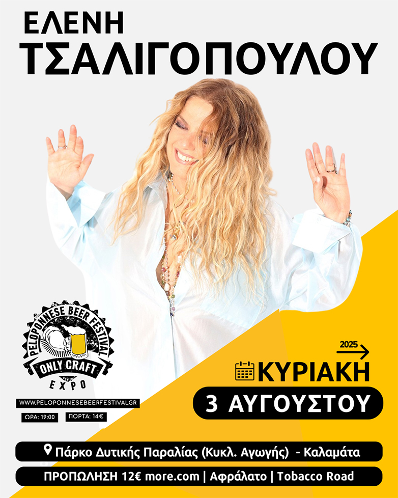 Την Κυριακή 3 Αυγούστου η Ελένη Τσαλιγοπούλου εμφανίζεται στο Πάρκο Δυτικής Παραλίας (Κυκλ. Αγωγής) στην Καλαμάτα, στο πλαίσιο του 5th Peloponnese Beer festival