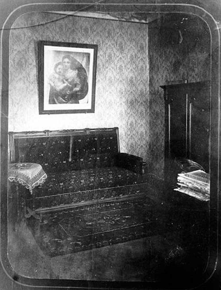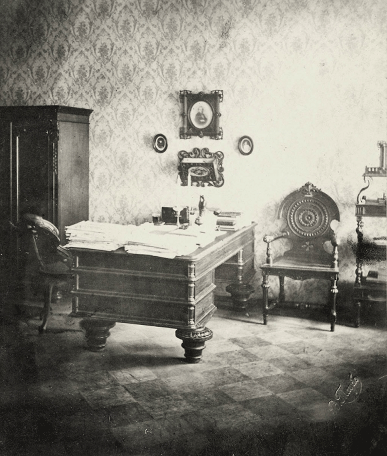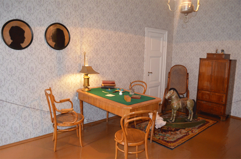 Το δωμάτιο, όπου ο Ντοστογιέφσκι περνούσε το μεγαλύτερο μέρος της ημέρας και δεχόταν τις επισκέψειςτου, ήταν πάντα ο χώρος μελέτης. Ένα γραφείο στη μέση του δωματίου, πάνω τουχειρόγραφα, ένα μελανοδοχείο και κηροπήγια. Δίπλα, ένα ερμάρι και ένας καναπές που χρησιμοποιούσε γιακρεβάτι.