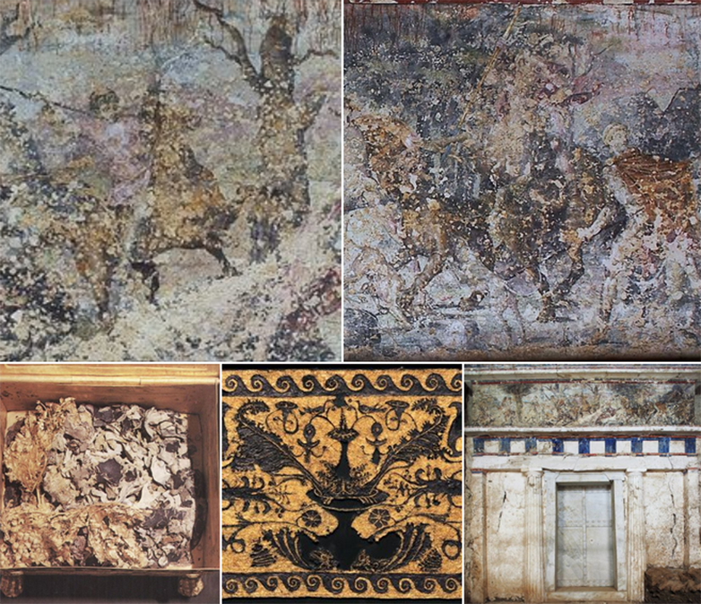 Ο Ισχυρισμός ότι το πορφυρό ύφασμα που βρέθηκε το 1977 στη χρυσή λάρνακα είναι ο περσικός μεσόλευκος βασιλικός χιτώνας του Αλέξανδρου ως Φαραώ (!!!) είναι τόσο λανθασμένος όσο και ο ισχυρισμός ότι το ζαρκάδι στην αριστερή άκρη της τοιχογραφίας είναι μια “περσική γαζέλα”! Κάποιος που κάνει περίπατο στα δάση των Αιγών, με λίγη τύχη, μπορεί και τώρα ακόμη να συναντήσει ζαρκάδια όπως και αγριογούρουνα σαν αυτά της τοιχογραφίας να περιφέρονται ολοζώντανα!