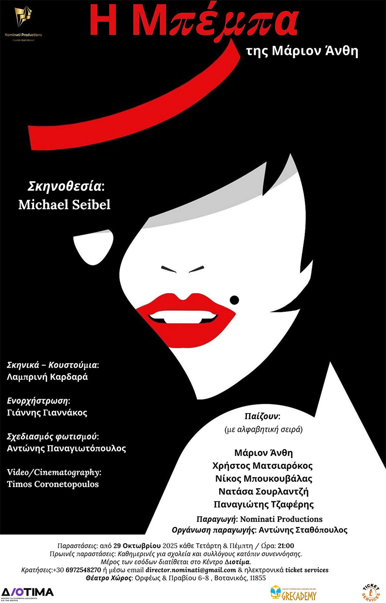 Προπώληση: Ticket Services (online: Η Μπέμπα, της Μάριον Άνθη: TicketServices.gr, τηλ. 210 7234567) ή στο +30 6972 548270 ή στο email director.nominati@gmail.com