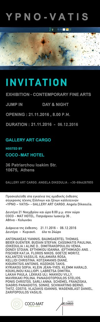Ο τίτλος της συγκεκριμένης Έκθεσης, «YPNO – VATIS», εκφράζει την σύμπνοια – Ύπνος – Κίνηση – Προφητεία (VATIS – προφήτης στα Λατινικά), μια έκθεση που το ταξίδι της ξεκινάει στις 21.11.2016, στο κέντρο της Αθήνας και θα μας συνοδέψει σε άλλες χώρες της Ευρώπης.