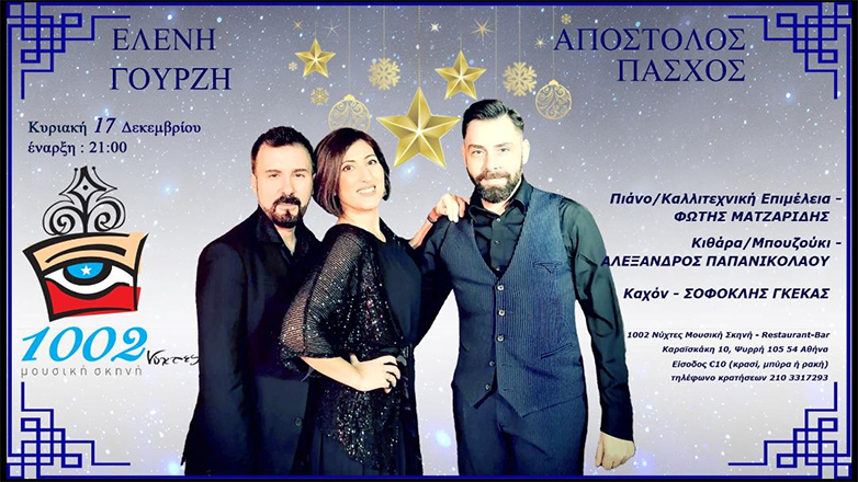 Επόμενος προορισμός για τον Δεκέμβριο είναι η μουσική σκηνή «1002 Νύχτες» την Κυριακή στις 17 του μήνα. Θα κάνουμε μία όμορφη σύμπραξη με τον Απόστολο Πάσχο, έναν νέο τραγουδιστή, με ελληνικά έντεχνα-λαϊκά τραγούδια του χτες και του σήμερα καθώς επίσης και αγαπημένα ντουέτα.