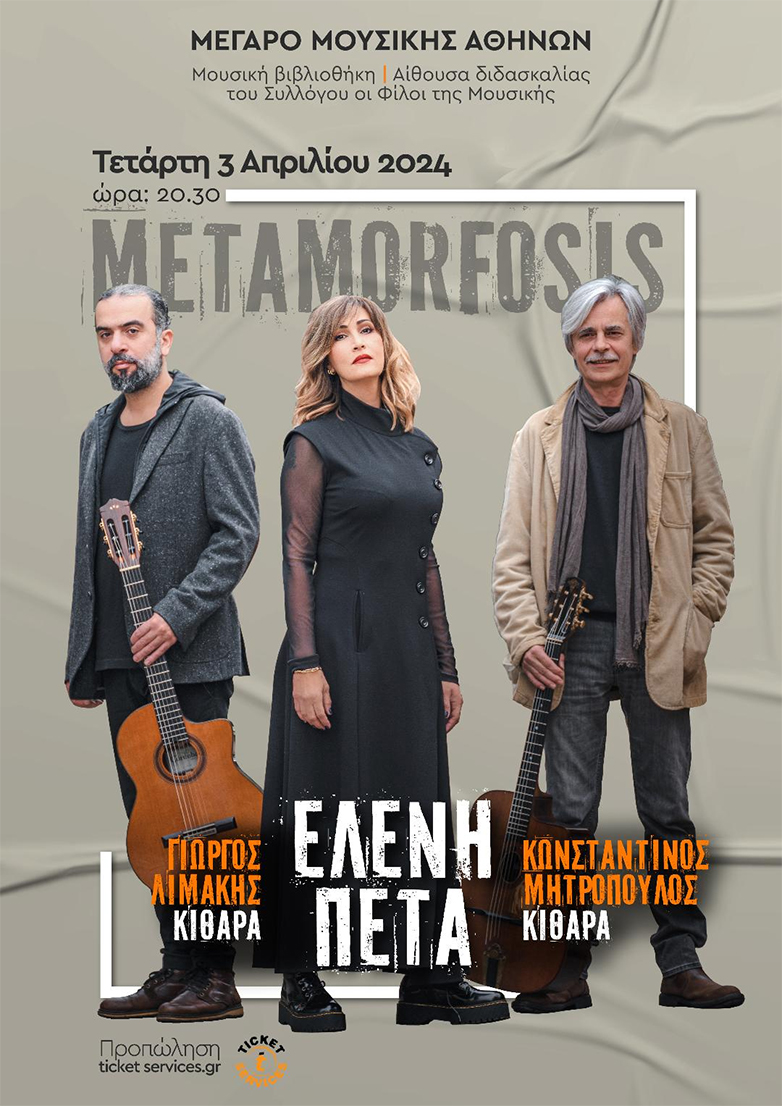 Στη Μουσική Βιβλιοθήκη – Αίθουσα Διδασκαλίας του Συλλόγου «Οι Φίλοι της Μουσικής», η ξεχωριστή ερμηνεύτρια συμπράττει με τους σολίστες της κιθάρας Γιώργο Λιμάκη και Κωνσταντίνο Μητρόπουλο, και μεταμορφώνουν τραγούδια-σταθμούς σε μια παρεΐστικη βραδιά μακριά από τον θόρυβο της καθημερινότητας, που θα μας ψυχαγωγήσει και θα μας διασκεδάσει.