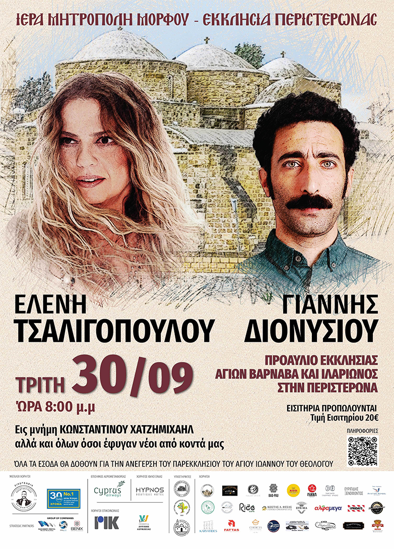 Η Ελένη Τσαλιγοπούλου, μία από τις πιο αγαπημένες ερμηνεύτριες και ο Γιάννης Διονυσίου, ένας από τους πιο ταλαντούχους και ελπιδοφόρους ερμηνευτές της γενιάς του, έρχονται την Τρίτη 30 Σεπτεμβρίου στην Περιστερώνα της Κύπρου και μας προσκαλούν σε ένα ξεχωριστό μουσικό ταξίδι.