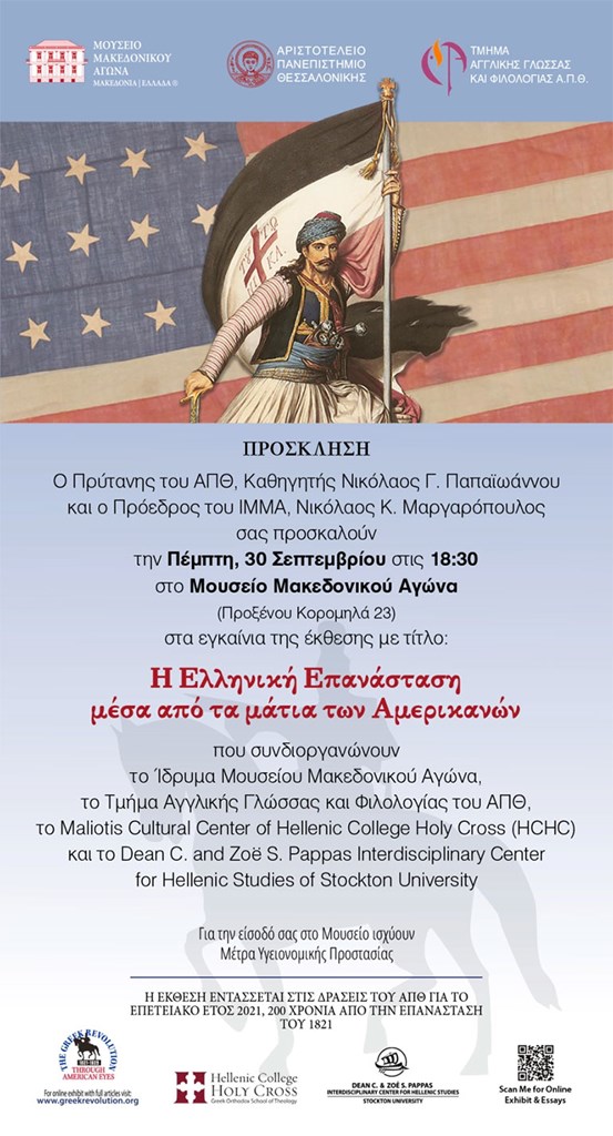 Η έκθεση πραγματοποιείται στο πλαίσιο των εορτασμών της 200ής επετείου της Ελληνικής Επανάστασης από το Ίδρυμα Μουσείου Μακεδονικού Αγώνα και της Νεότερης Ιστορίας της Μακεδονίας με υπεύθυνες συντονισμού και διοργάνωσης την κ. Μαυρογένη και την κ. Τσατσάια, σε συνεργασία με τη Ζωή Δέτση, καθηγήτρια του Τομέα Αμερικανικής Λογοτεχνίας και Πολιτισμού του Τμήματος Αγγλικής Γλώσσας και Φιλολογίας του ΑΠΘ και τους φορείς Maliotis Cultural Center of Hellenic College Holy Cross (HCHC) και Dean C. and Zoë S. Pappas Interdisciplinary Center for Hellenic Studies of Stockton University των Ηνωμένων Πολιτειών.