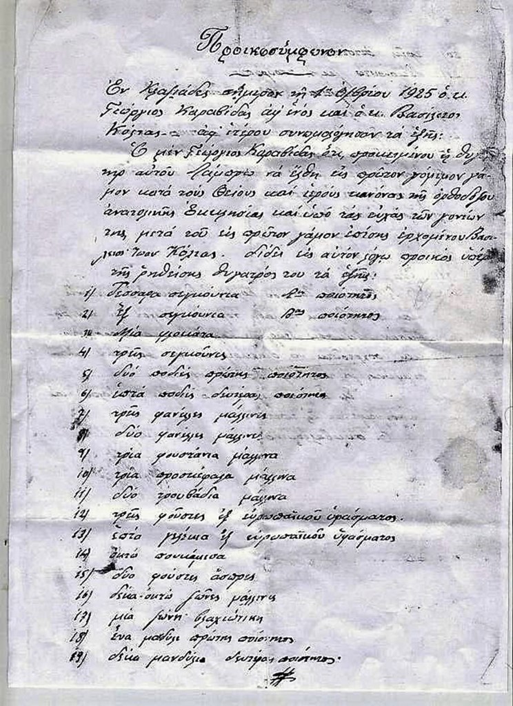 Ίσον και όμοιον της προικοπαραδόσεως εις τον νοταρικόν Κώδικα της Κυρίας Αικατερίνης, θυγατρός του σιορ Πιέρου Κλάδου, όπου της επαρέδωσεν ο ρηθείς πατήρ αυτής ομού και η μήτηρ αυτής Κυρία Χρυσούλα διά πατρικόν και μητρικόν μοιράδιον εις προίκα τα κάτωθι.