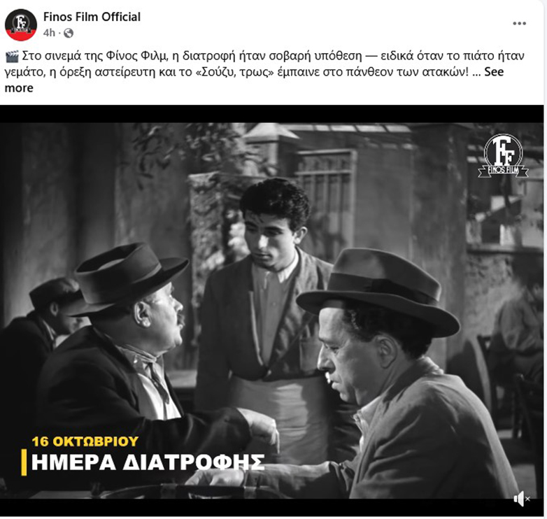 Παγκόσμια Ημέρα Διατροφής σήμερα (16/10) και η Φίνος Φιλμ τιμά την ημέρα με ένα απολαυστικό βίντεο, το οποίο περιλαμβάνει χαρακτηριστικές ατάκες από παλιές ταινίες του ελληνικού κινηματογράφου, με τους ήρωες να προσφέρουν στιγμές γέλιου.