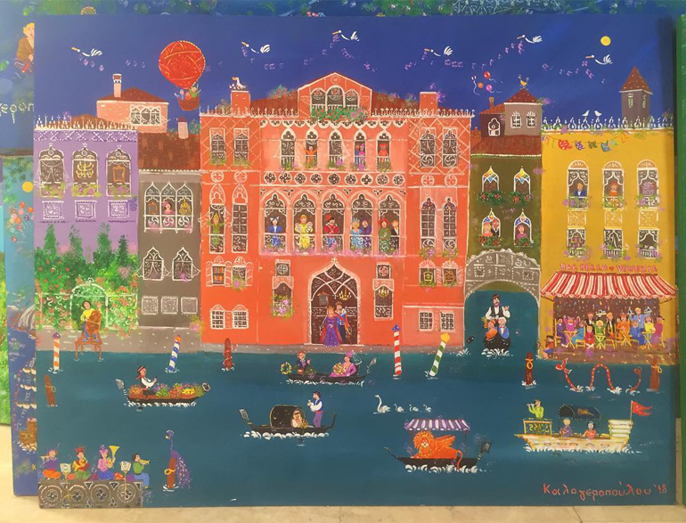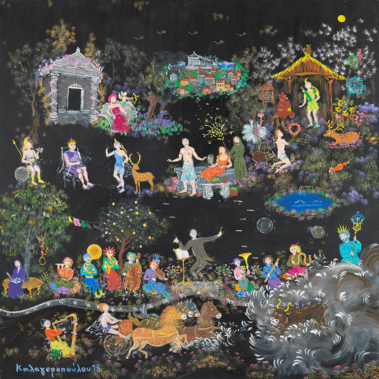 »Στο έργο της Καλογεροπούλου, η σχεδιαστική δεινότητα, η αναβλύζουσα χρωματική πανδαισία και η αφηγηματική αλληγορία, πλάθουν κοιτίδες πολιτισμικής μνήμης και φαντασμαγορικές ενδιάμεσες ζώνες όπου τα πάντα μπορούν να συμβούν. Στα φιδίσια θαλασσινά στενά, αρμενίζουν περήφανα παραμυθένια τρικάταρτα. Στις χλοερές εξοχές της με τους ρωμαλέους κισσούς και τα ευγενικά τριανταφυλλένια αρχοντικά, στήνονται υπαίθριες νυχτερινές συναυλίες. Επάνω σε γενναιόφρονα πόντιουμ και πάλκα, αεικίνητοι διευθυντές ορχήστρας και ρομαντικές ηρωίδες της όπερας συναντούν τους οργανοπαίκτες με τα χειροποίητα λαϊκά όργανα και τους περιπλανώμενους θιάσους μιας αέναης παιδικής ηλικίας.