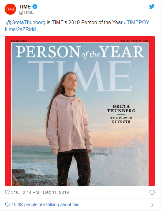 Η νεαρή ακτιβίστρια Γκρέτα Τούνμπεργκ αναδείχθηκε Πρόσωπο της Χρονιάς από το περιοδικό Time μετά την έντονη δράση της σε ζητήματα που αφορούν το κλίμα.