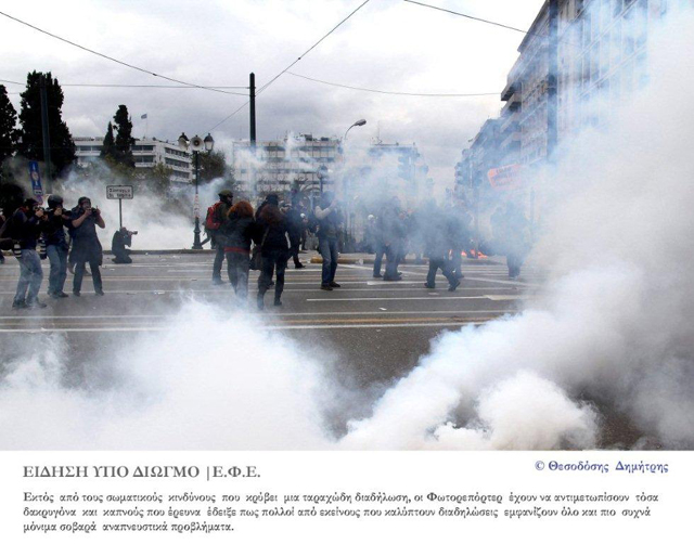 Μέσω αυτής της έκθεσης διαπιστώνουμε ότι η κάλυψη γεγονότων στην Αθήνα είναι πολύ πιο επικίνδυνη από την κάλυψη πολεμικών γεγονότων. Η έκθεση παρουσιάζει τους κινδύνους που εμπεριέχει μία δημοσιευμένη – ή μη- φωτογραφία, πολλές από τις οποίες δεν έχουν τύχει δημοσίευσης, και αποτελεί ένα ελάχιστο φόρο τιμής στους φωτορεπόρτερ.