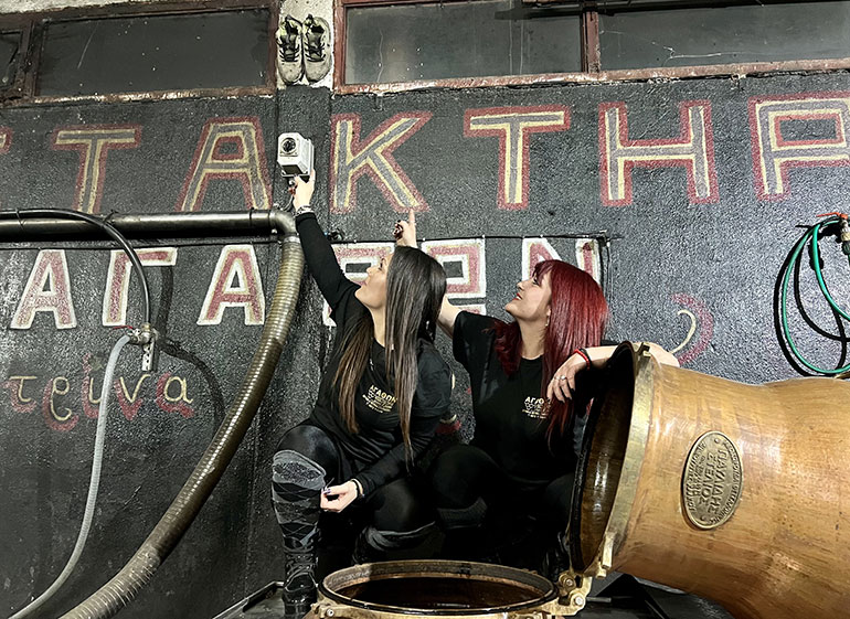 Το τσίπουρο, αρωματισμένο με γλυκάνισο ή άνευ -γράπα, όπως τη λένε στα μέρη μας- είναι κομμάτι της ζωής των δυο νέων γυναικών, που δουλεύοντας στο αποστακτήριο νιώθουν, όπως αναφέρουν, να έχουν τον πατέρα τους δίπλα, σε κάθε βήμα. «Από τον Σεπτέμβριο που ήρθαμε εδώ δειλά δειλά κι αρχίσαμε να καθαρίζουμε και να προετοιμαζόμαστε, νιώσαμε πως βάλαμε τα παπούτσια του μπαμπά μας και περπατάμε», τονίζουν με μια φωνή και ταυτόχρονα το βλέμμα τους στρέφεται στο ζευγάρι που είναι κρεμασμένο στον τοίχο.