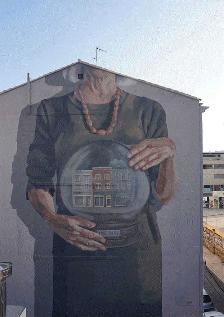 Τρεις από τις πιο εμβληματικές τοιχογραφίες της πόλης έχουν επίσης διατηρηθεί: ένας φόρος τιμής στην Τζέιν Τζέικομπς που φιλοτέχνησε το 2019 στη συνοικία Κάρμεν, η συμμετοχή της στο πρότζεκτ “Sense Murs” στη συνοικία Λα Πούντα, με τη γιγαντιαία γυναικεία φιγούρα που υπερασπίζεται ένα περιβόλι με ντομάτες και η παρέμβασή της στην πρόσοψη του κτηρίου La Base, στη μαρίνα, όπου παρουσίασε μια από τις πιο γνωστές σκηνές της πλήθους.