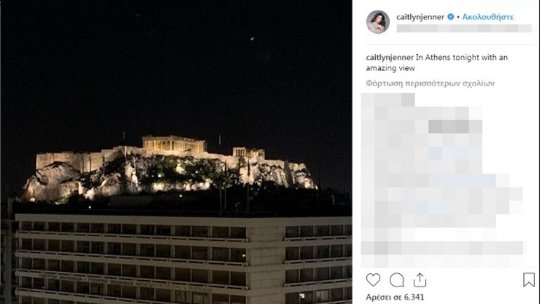 Στη φωτογραφία φαίνεται η φωτισμένη Ακρόπολη και η 69χρονη Κέιτλιν γράφει: «Στην Αθήνα απόψε με καταπληκτική θέα».