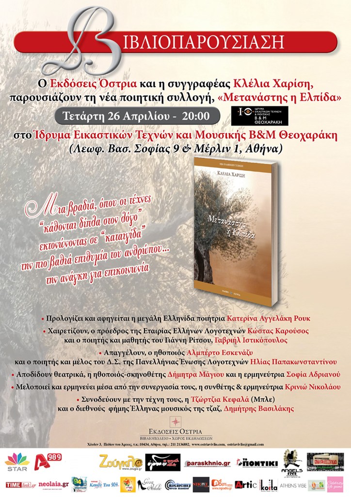 Η Κλέλια Χαρίση, παρουσιάζει τη νέα της ποιητική συλλογή «Μετανάστης η Ελπίδα» από τις εκδόσεις Όστρια, την Τετάρτη 26 Απρλίου στις 20:00 στο Ίδρυμα Εικαστικών Τεχνών και Μουσικής Β&Μ θεοχαράκη ( Λ. Βασ. Σοφ. 9 & Μέρλιν 1, Αθήνα) , σε μια βραδιά όπου την ποίησή της:
