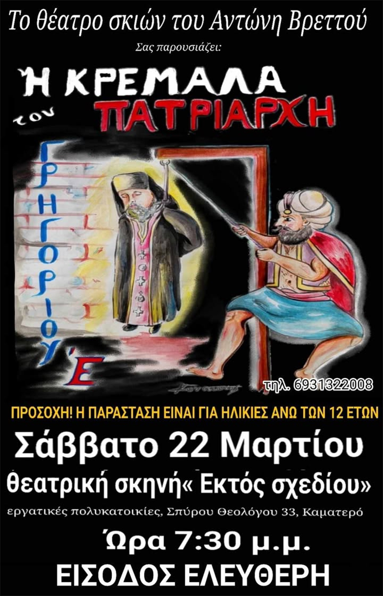 Το Θέατρο Σκιών του Αντώνη Βρεττού ετοιμάζεται να προσφέρει στο κοινό μια μοναδική εμπειρία, μεταφέροντάς μας σε μια από τις πιο δραματικές στιγμές της ελληνικής ιστορίας. Το Σάββατο 22 Μαρτίου, στη θεατρική σκηνή Εκτός Σχεδίου στο Καματερό, θα παρουσιαστεί το έργο «Η Κρεμάλα του Πατριάρχη Γρηγορίου Ε’», μια παράσταση που συνδυάζει την παράδοση του Καραγκιόζη με ιστορικά γεγονότα.