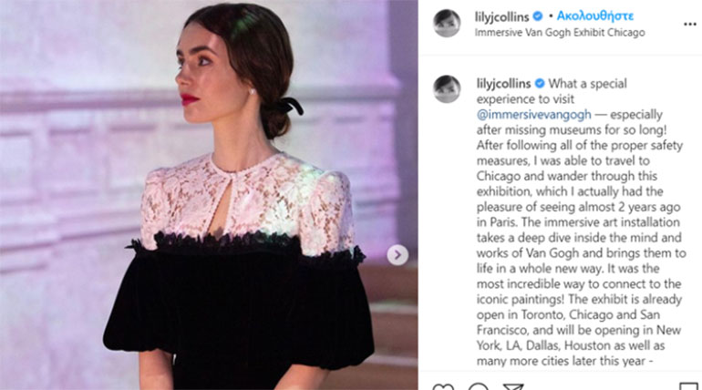 Η Λίλι Κόλινς επισκέφθηκε έκθεση τέχνης στο Σικάγο. Πριν από την αναχώρησή της για τη Γαλλία για τα γυρίσματα του δεύτερου κύκλου της σειράς «Emily In Paris», η υποψήφια για Χρυσή Σφαίρα ηθοποιός επισκέφθηκε έκθεση για τον Βαν Γκογκ ενώ βρισκόταν στην πόλη.