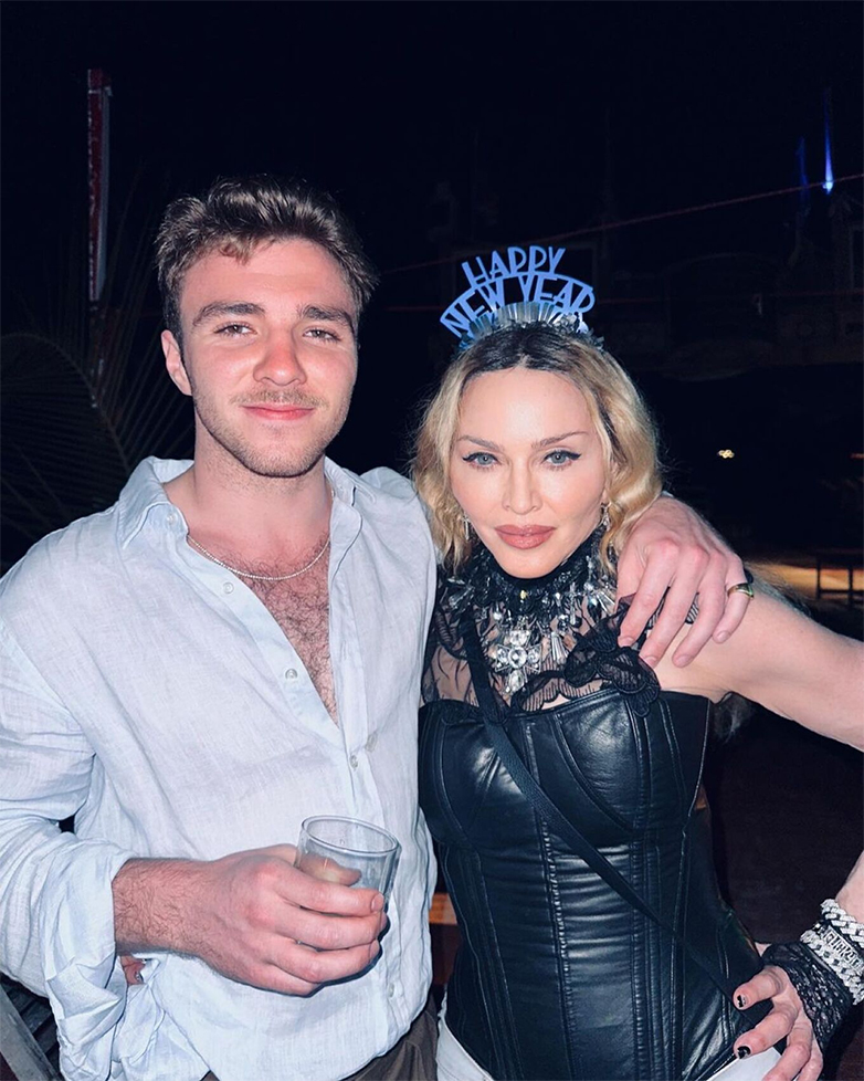 Σε άλλη φωτογραφία, η Μαντόνα φορούσε έναν δερμάτινο κορσέ και μια τιάρα «Happy New Year», καθώς πόζαρε με καθένα από τα παιδιά της.
