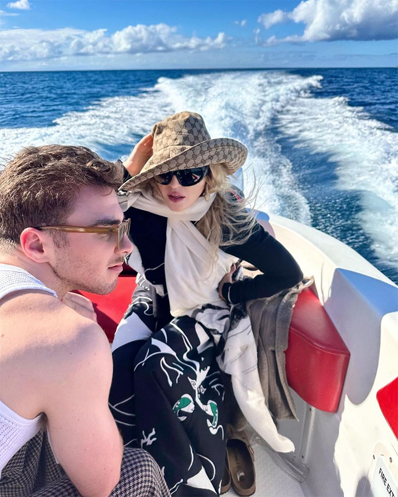 Σε μια φωτογραφία, η τραγουδίστρια και ο γιος της Ρόκο έχουν φόντο τη γαλάζια θάλασσα και σε μια άλλη, η Λούρδη ποζάρει σε μια selfie στο σκάφος.
