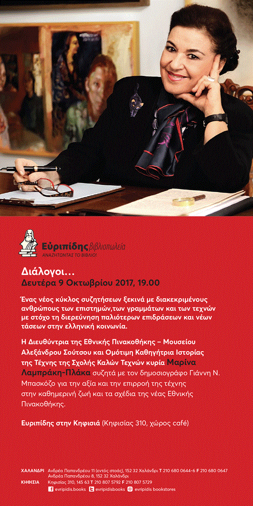 Τη Δευτέρα 9/10 στις 19.00 η Διευθύντρια της Εθνικής Πινακοθήκης κυρία Μαρίνα Λαμπράκη-Πλάκα θα βρίσκεται στον Ευριπίδη στην Κηφισιά, στο πλαίσιο του νέου κύκλου συζητήσεων των βιβλιοπωλείων Ευριπίδης με τίτλο «Διάλογοι».