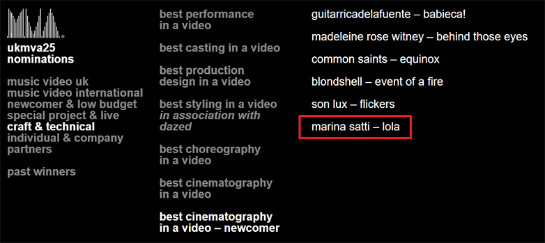 Για δεύτερη φορά στην καριέρα της διακρίνεται στα UK Music Video Awards, τον κορυφαίο θεσμό παγκοσμίως για το music video και το music film making: το 2022 με το “YIATI POULI’M” στην κατηγορία Best Alternative Video – Newcomer και τώρα, το 2025, επιστρέφει με το “LOLA” στην κατηγορία Craft & Technical: Best Cinematography in a Video – Newcomer.
