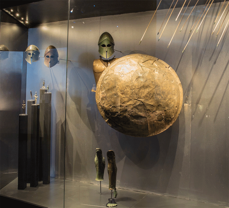 Το μουσειολογικό αφήγημα προσπαθεί να μείνει πιστό στις περιγραφές των αρχαίων συγγραφέων, χωρίς να ακολουθεί τα στερεότυπα της ιστορικής αναπαράστασης των μαχών. H επιλογή των αρχαίων έργων, που σχετίζονται άμεσα ή έμμεσα με την εποχή, στοχεύει στο συναίσθημα του θεατή, στη φαντασία και κυρίως στις μνήμες, που αναδύονται για τις στιγμές που βίωσαν οι άνθρωποι τότε. Οι στιγμές αυτές καθόρισαν τις ζωές, τις ιδέες και τις πεποιθήσεις τους, οι οποίες στη συνέχεια μεταλαμπαδεύτηκαν στη σύγχρονη εποχή και στον σύγχρονο δυτικό πολιτισμό.