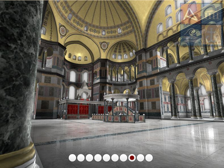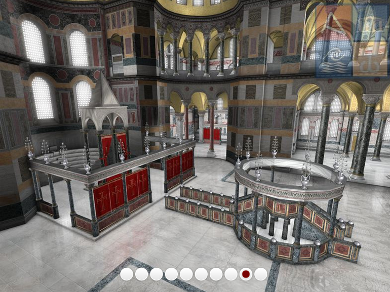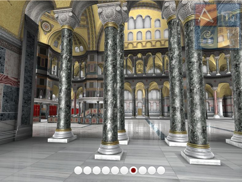 Ως αφετηρία της περιήγησης έχει επιλεχθεί η εξέλιξη της Αγίας Σοφίας από την Ιουστινιάνεια περίοδο (6οςαιώνας).Ουσιαστικά, χρησιμοποιείται το αρχιτεκτονικό μοντέλο του τέλους του 6ου αιώνα. Ταυτόχρονα, ανασυστάθηκε το μεγαλύτερο μέρος του εσωτερικού διακόσμου κατά την Κομνήνεια περίοδο (11ος-12ος αιώνας), όπως αυτός σωζόταν και αποκαλύφθηκε από την έρευνα μέχρι τα μέσα του 20ου αιώνα.