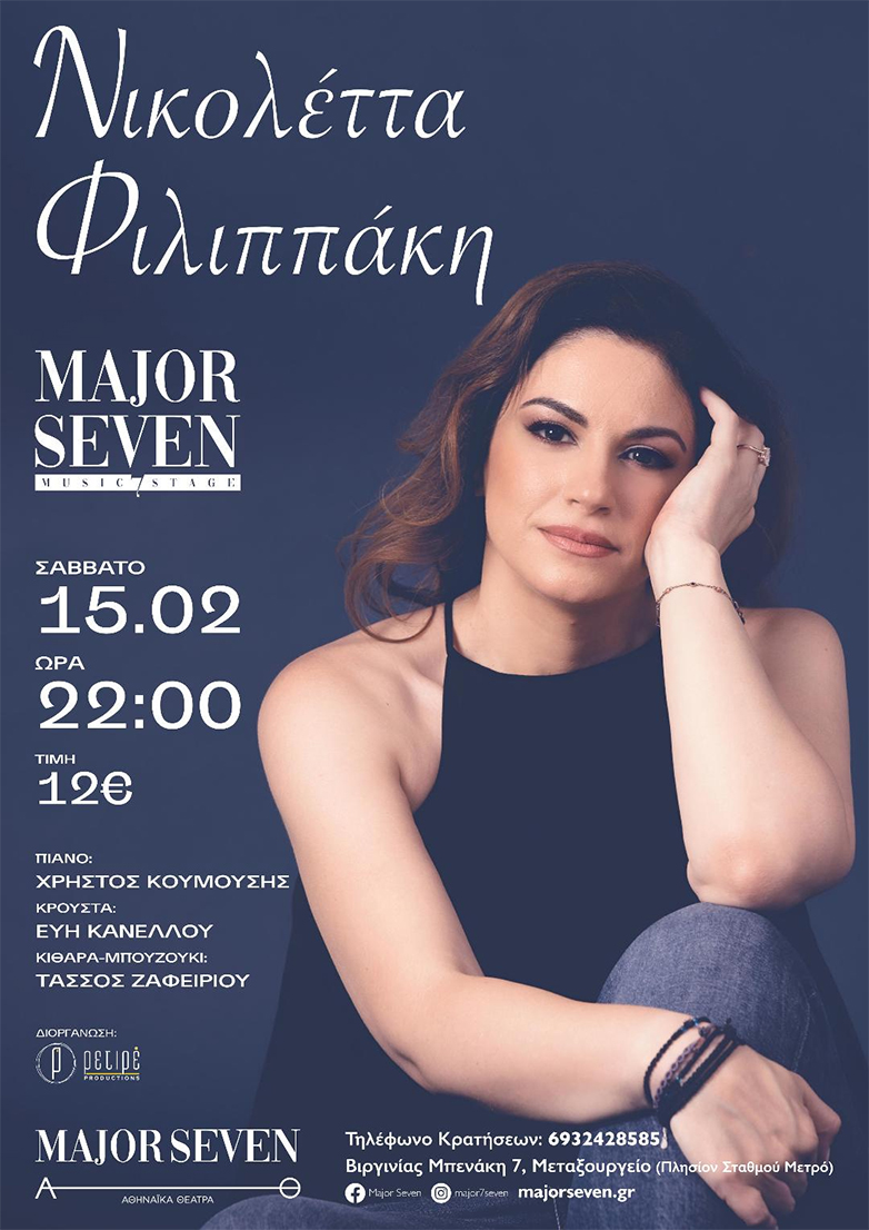 Η Νικολέττα Φιλιππάκη, μαζί με τρεις εξαιρετικούς μουσικούς, μας προσκαλεί το Σάββατο 15 Φεβρουαρίου στη μουσική σκηνή Major Seven, σε μία μουσική βραδιά με ένταση, συναίσθημα και αντιθέσεις! Η Νικολέττα Φιλιππάκη για μία ακόμα φορά θα ξεδιπλώσει τον δυναμισμό και τη μοναδική της ενέργεια πάνω στη σκηνή.