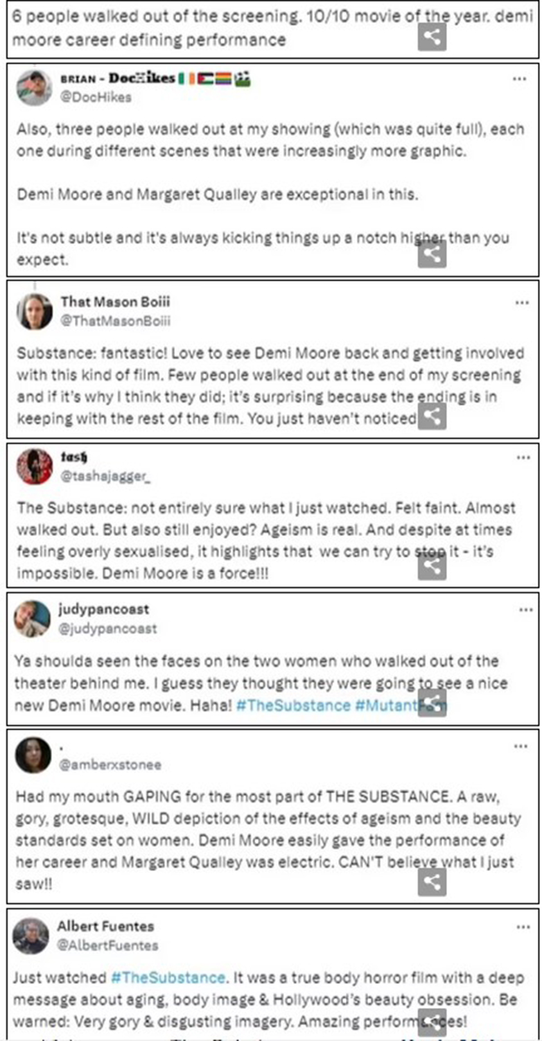 Οι θεατές της ταινίας περιγράφουν στο X, (πρώην Twitter, πόσο «αηδιαστικό» βρήκαν το The Substance – και επίσης είπαν για άλλους θεατές που έφυγαν από τις  κινηματογραφικές αίθουσες στη μέση της προβολής.