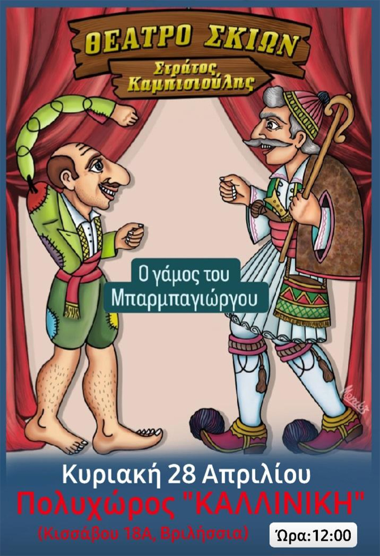 Ο γνωστός καραγκιοζοπαίκτης Στράτος Καμπισιούλης, σε συνεργασία με τον Σύλλογο «Καλλινίκη», έρχεται στα Βριλήσσια, την Κυριακή 28 Απριλίου, στον πολυχώρο εκδηλώσεων της «Καλλινίκης» με μια παραδοσιακή παράσταση: «Ο Γάμος του Μπαρμπαγιώργου».