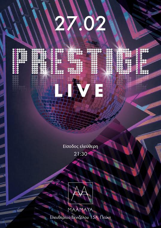 Το Maamaya υποδέχεται τους «Prestige» σ’ ένα εκρηκτικό live το Σάββατο 27 Φεβρουαρίου! Η εξαμελής νεανική μπάντα, με επιτυχίες από τα 80′ s μέχρι σήμερα, έρχεται με χορευτική διάθεση στον νέο φιλόξενο χώρο της Πεύκης και υπόσχεται ένα αξέχαστο dance party!