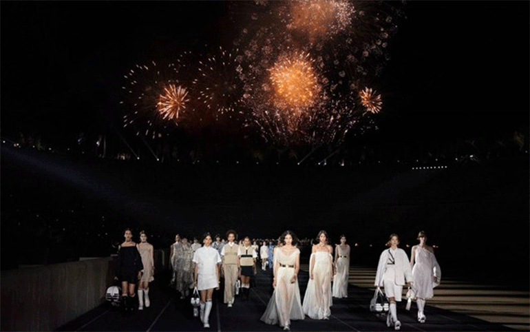 «Είναι τέλειο. Δεν υπάρχει τίποτα που πρέπει να γίνει» λέει η καλλιτεχνική διευθύντρια, Μαρία Γκράτσια Κιούρι κατά την περιήγηση της στο Καλλιμάρμαρο. Η ίδια όπως και οι συνεργάτες της ανέδειξαν τη συλλογή Cruise 2022, μέσα από το σύμβολο του Αθλητισμού και των Ολυμπιακών Αγώνων. Συνολικά χρησιμοποιήθηκαν τετρακόσιοι προβολείς και στην κορυφή του Σταδίου τοποθετήθηκαν 88 σημαίες σχεδιασμένες από συνεργάτες του οίκου Dior.