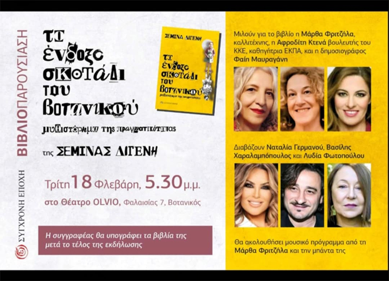 Μιλούν για το βιβλίο η Μάρθα Φριτζήλα, καλλιτέχνις, η Αφροδίτη Κτενά βουλευτής του ΚΚΕ, καθηγήτρια ΕΚΠΑ, και η δημοσιογράφος Φαίη Μαυραγάνη.