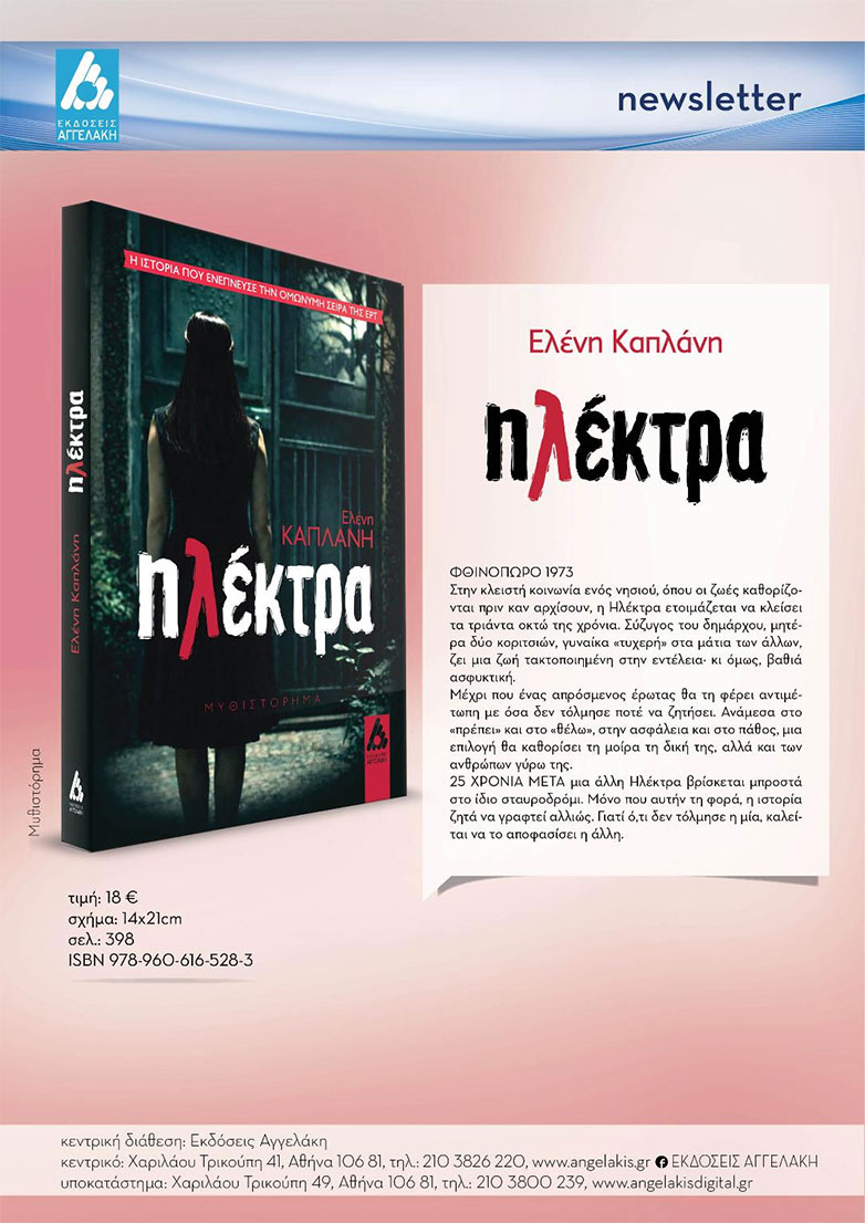 Η ταλαντούχα συγγραφέας Ελένη Καπλάνη έχει καταφέρει να ξεχωρίσει στον χώρο της λογοτεχνίας, ταξιδεύοντας τους αναγνώστες της σε διαδρομές γεμάτες συναίσθημα και βαθιές ανθρώπινες αξίες. Μετά τη μεγάλη επιτυχία του «Μαύρου Ρόδου», επιστρέφει με το νέο της βιβλίο «Ηλέκτρα», που κυκλοφορεί από τις εκδόσεις Αγγελάκη και υπόσχεται να συγκινήσει.