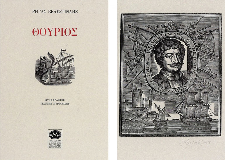 * O Θούριος του Ρήγα Βελεστινλή, με αυθεντικές ξυλογραφίες του Γιάννη Κυριακίδη (1998). Η παρουσίαση της έκδοσης πραγματοποιήθηκε κατά τη διάρκεια της ημερίδας: «Ρήγας Βελεστινλής, 200 χρόνια από το θάνατό του», που διοργάνωσε ο Δήμος Θεσσαλονίκης και το Κέντρο Ιστορίας Θεσσαλονίκης. Το βιβλίο τυπώθηκε σε επίπεδο πιεστήριο, σε 120 αριθμημένα αντίτυπα, η στοιχειοθεσία έγινε στο χέρι, από κάσα με στοιχεία 16’’. Οι επτά ξυλογραφίες που Κυριακίδη χαράχτηκαν σε όρθιο ξύλο, τυπώθηκαν σε επίπεδο πιεστήριο και είναι υπογεγραμμένες από τον χαράκτη.