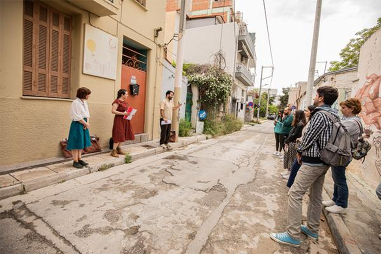 Με οδηγούς τους τρεις θεατρικούς ξεναγούς-ηθοποιούς Σοφία Νικολοπούλου, Αγγελική Παναγιωτοπούλου και Χρήστο Χριστόπουλο, οι συμμετέχοντες θα κάνουν στάσεις σε μικρά στενά και μεγάλους δρόμους, εκεί όπου η ιστορία της γειτονιάς συναντά τις φωνές και τις μνήμες των κατοίκων της.