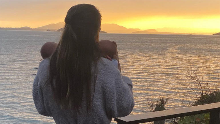 Δημοσιεύοντας ένα πολύ συγκινητικό στιγμιότυπο που δείχνει να κρατά τα μωρά της κοιτάζοντας το ηλιοβασίλεμα έγραψε στη λεζάντα: «Δεν ήταν εύκολο! Αλλά αγόρι (και κορίτσι!) άξιζε τον κόπο». Επίσης η νέα μαμά ευχήθηκε «Καλό Πάσχα!» στους 1,4 εκατ. ακολούθους της, ενώ επισήμανε ότι είναι μία «δημοσίευση από τον Παράδεισο».