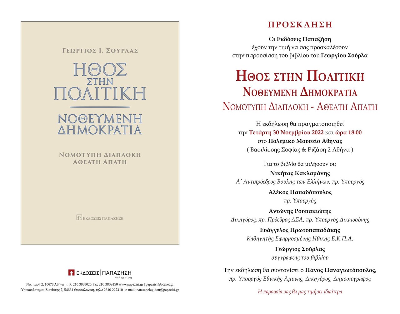 Οι Εκδόσεις Παπαζήση και ο συγγραφές Γεώργιος Σούρλας σας προσκαλούν στην παρουσίαση του βιβλίου «Ήθος στην πολιτική: Νοθευμένη δημοκρατία – νομότυπη διαπλοκή».