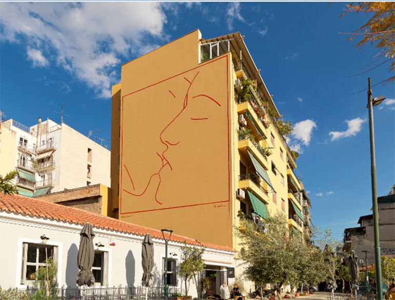 Το Ίδρυμα Ωνάση παρουσιάζει την τοιχογραφία «Το φιλί» του Ηλία Παπαηλιάκη στην πλατεία Αυδή.