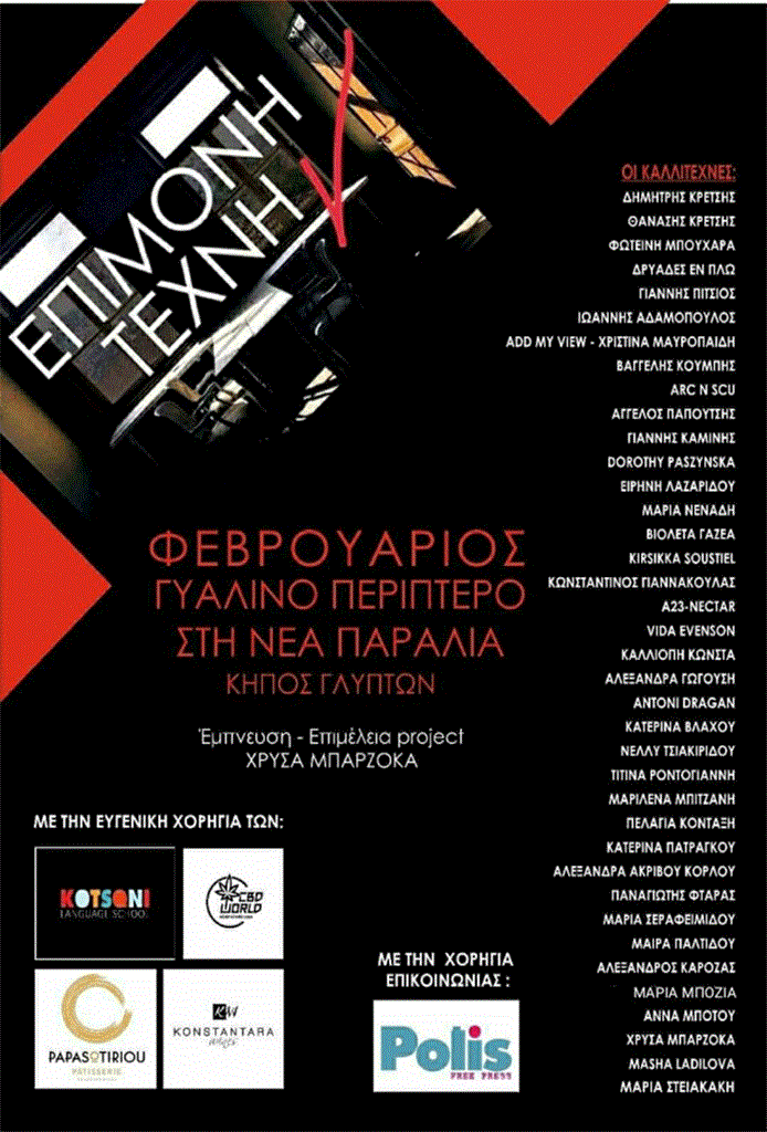 Συμμετέχουν: ΔΗΜΗΤΡΗΣ ΚΡΕΤΣΗΣ, ΘΑΝΑΣΗΣ ΚΡΕΤΣΗΣ, ΦΩΤΕΙΝΗ ΜΠΟΥΧΑΡΑ, ΔΡΥΑΔΕΣ ΕΝ ΠΛΩ, ΓΙΑΝΝΗΣ ΠΙΤΣΙΟΣ, ΙΩΑΝΝΗΣ ΑΔΑΜΟΠΟΥΛΟΣ, ADD MY VIEW – ΧΡΙΣΤΙΝΑ ΜΑΥΡΟΠΑΙΔΗ, ΒΑΓΓΕΛΗΣ ΚΟΥΜΠΗΣ, ARC N SCU, ΑΓΓΕΛΟΣ ΠΑΠΟΥΤΣΗΣ, ΓΙΑΝΝΗΣ ΚΑΜΙΝΗΣ, DOROTHY PASZYNSKA, ΕΙΡΗΝΗ ΛΑΖΑΡΙΔΟΥ, ΜΑΡΙΑ ΝΕΝΑΔΗ, ΒΙΟΛΕΤΑ ΓΑΖΕΑ, KIRSIKKA SOUSTIEL, ΚΩΝΣΤΑΝΤΙΝΟΣ ΓΙΑΝΝΑΚΟΥΛΑΣ, A23-NECTAR, VIDA EVENSON, ΚΑΛΛΙΟΠΗ ΚΩΝΣΤΑ, ΑΛΕΞΑΝΔΡΑ ΓΩΓΟΥΣΗ, ΑΝΤΟΝΙ DRAGAN, ΚΑΤΕΡΙΝΑ ΒΛΑΧΟΥ, ΝΕΛΛΥ ΤΣΙΑΚΙΡΙΔΟΥ, ΤΙΤΙΝΑ ΡΟΝΤΟΓΙΑΝΝΗ, ΜΑΡΙΛΕΝΑ ΜΠΙΤΖΑΝΗ, ΠΕΛΑΓΙΑ ΚΟΝΤΑΞΗ, ΚΑΤΕΡΙΝΑ ΠΑΤΡΑΓΚΟΥ, ΑΛΕΞΑΝΔΡΑ ΑΚΡΙΒΟΥ ΚΟΡΛΟΥ, ΠΑΝΑΓΙΩΤΗΣ ΦΤΑΡΑΣ, ΜΑΡΙΑ ΣΕΡΑΦΕΙΜΙΔΟΥ, ΜΑΙΡΑ ΠΑΛΤΙΔΟΥ, ΑΛΕΞΑΝΔΡΟΣ ΚΑΡΟΖΑΣ, ΜΑΡΙΑ ΣΤΕΙΑΚΑΚΗ, ΜΑΡΙΑ ΜΠΟΖΙΑ, MASHA LADILOVA, ΑΝΝΑ ΜΠΟΤΟΥ, ΧΡΥΣΑ ΜΠΑΡΖΟΚΑ.