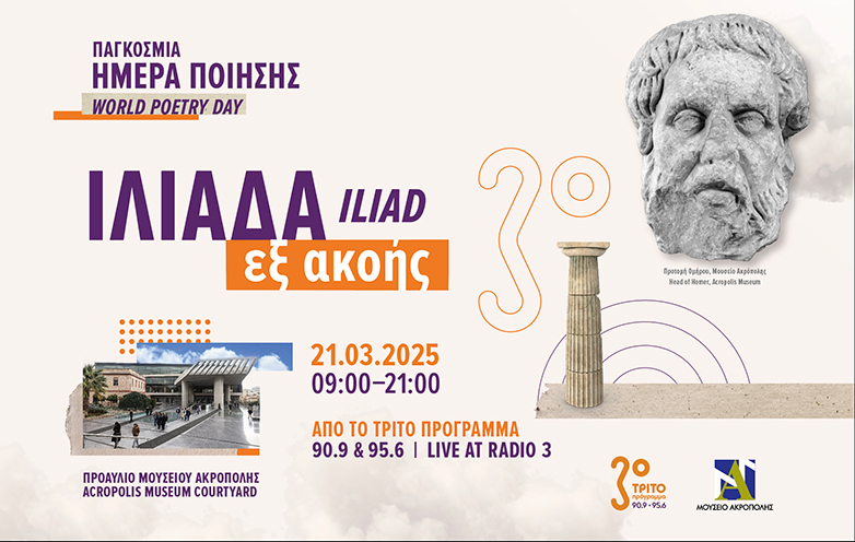 Με την ευκαιρία της Παγκόσμιας Ημέρας Ποίησης, την Παρασκευή 21 Μαρτίου 2025, το Μουσείο Ακρόπολης προσκαλεί τους επισκέπτες στον προαύλιο χώρο του να παρακολουθήσουν μια μαραθώνια συνακρόαση του ομηρικού έπους της Ιλιάδας, την οποία διοργανώνει το Τρίτο Πρόγραμμα της ΕΡΤ.