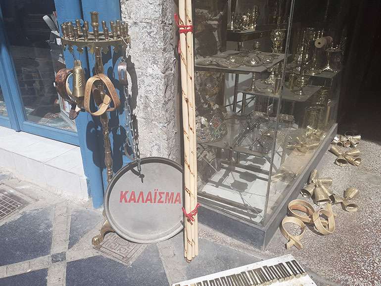 Λαμπερά περίτεχνα διακοσμητικά, εκκλησιαστικά είδη, ειδώλια, σκεύη και άλλα αντικείμενα με αρχαιοελληνικά μοτίβα, κλειδιά, κουδούνια, δεκάδες πράγματα, όλα φτιαγμένα με πολύ μεράκι.